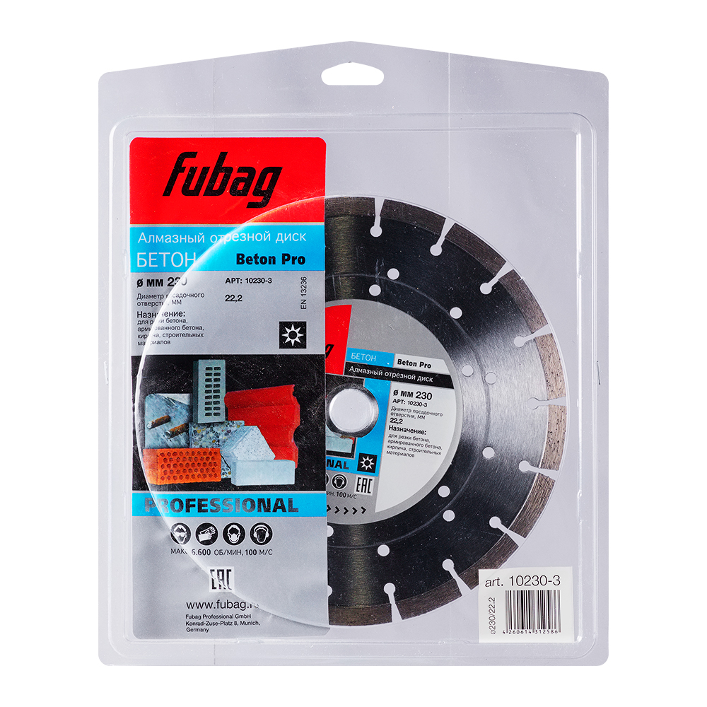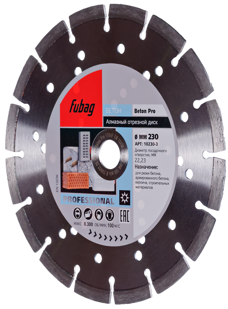 Характеристики Алмазный отрезной диск FUBAG Бетон Про (Beton Pro) D230 мм / 22,2 мм по бетону