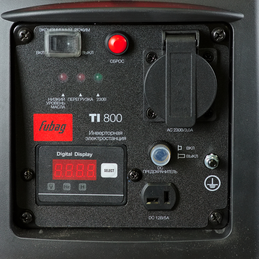 • Цифровой дисплей позволяет контролировать выходное напряжение, частоту переменного тока, количество отработанных моточасов