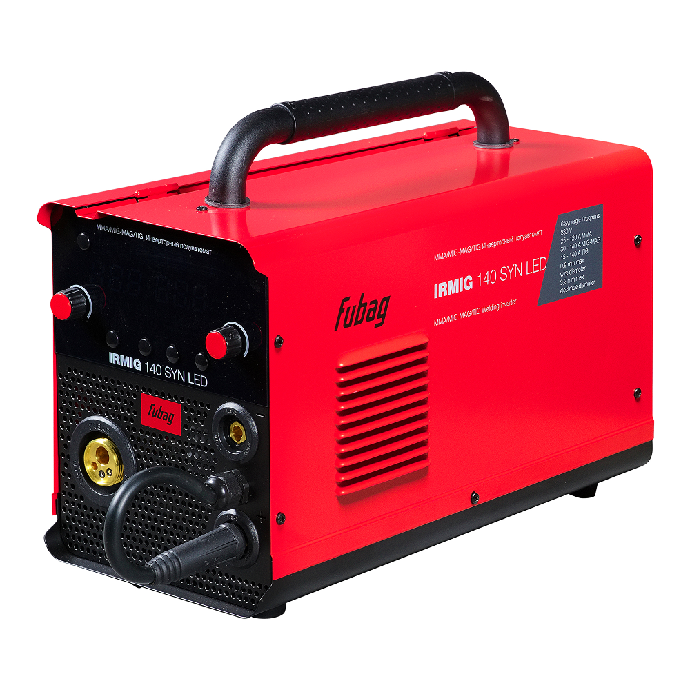 Сварочный полуавтомат Fubag IRMIG 140 SYN LED – высокопроизводительный инверторный аппарат с ярким LED-дисплеем. Выбор методов сварки MMA, MIG/MAG, TIG Lift. Имеет 6 встроенных синергетических программ.Оснащен ярким, хорошо читаемым LED дисплеем с индикацией сварочного тока, напряжения и коррекции напряжения. Аппарат работает в распространенном диапазоне сварочного тока 15-140 А с проволокой диаметром от 0,6 до 0,8 мм, катушкой весом 5 кг и диаметром 200 мм.
